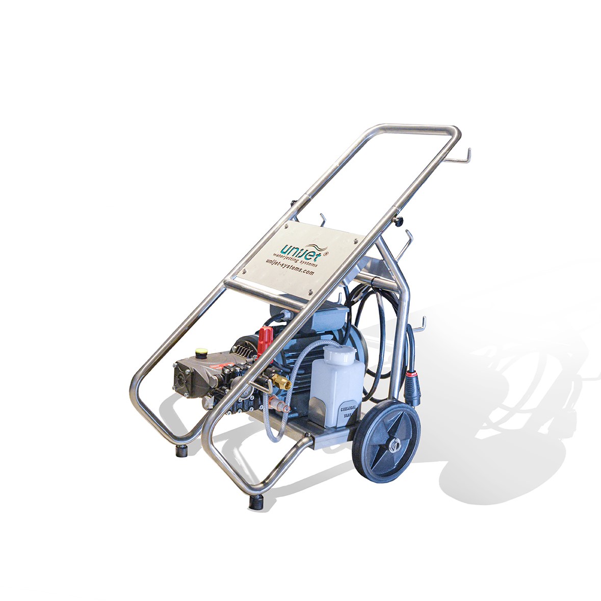 Waterjetting unit with sandblasting and hot water compatibility up to 180 bar, driven by an electric single-phase motor for the Shipping, Industrial and Construction sector.